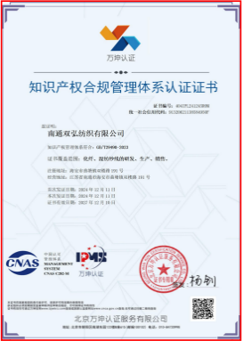 Certifikacija sustava upravljanja poštivanjem intelektualnog vlasništva je aktivnost procjene sukladnosti u kojoj tijelo za certificiranje treće strane procjenjuje interni sustav upravljanja intelektualnim vlasništvom poduzeća kako bi potvrdio da u skladu sa zahtjevima relevantnih nacionalnih standarda ili tehničkih specifikacija. Trenutno Double Great Company ima 5 domaćih registriranih zaštitnih znakova i 2 Madrid International Registrirana zaštitna znaka. Dvostruki veliki zaštitni znak poznati je zaštitni znak u Kini; Ima više od 50 patenata nacionalnih izuma i patenata komunalnog modela, a osvojio je nagradu za patentnu patentnu industriju u Kini; poduzeo je 4 nacionalne baklje i 5 projekata plana iskre; Formulirao je 3 nacionalna standarda, 11 industrijskih standarda, 4 grupna standarda i 3 standarda potrošnje u jedinici za trgovinu Carinom; Proveo je industriju-sveučilište, a 5 ključnih tehnoloških i znanstvenih i tehnoloških projekata osvojilo je drugu nagradu napretka znanosti i tehnologije u tekstilnoj industriji.