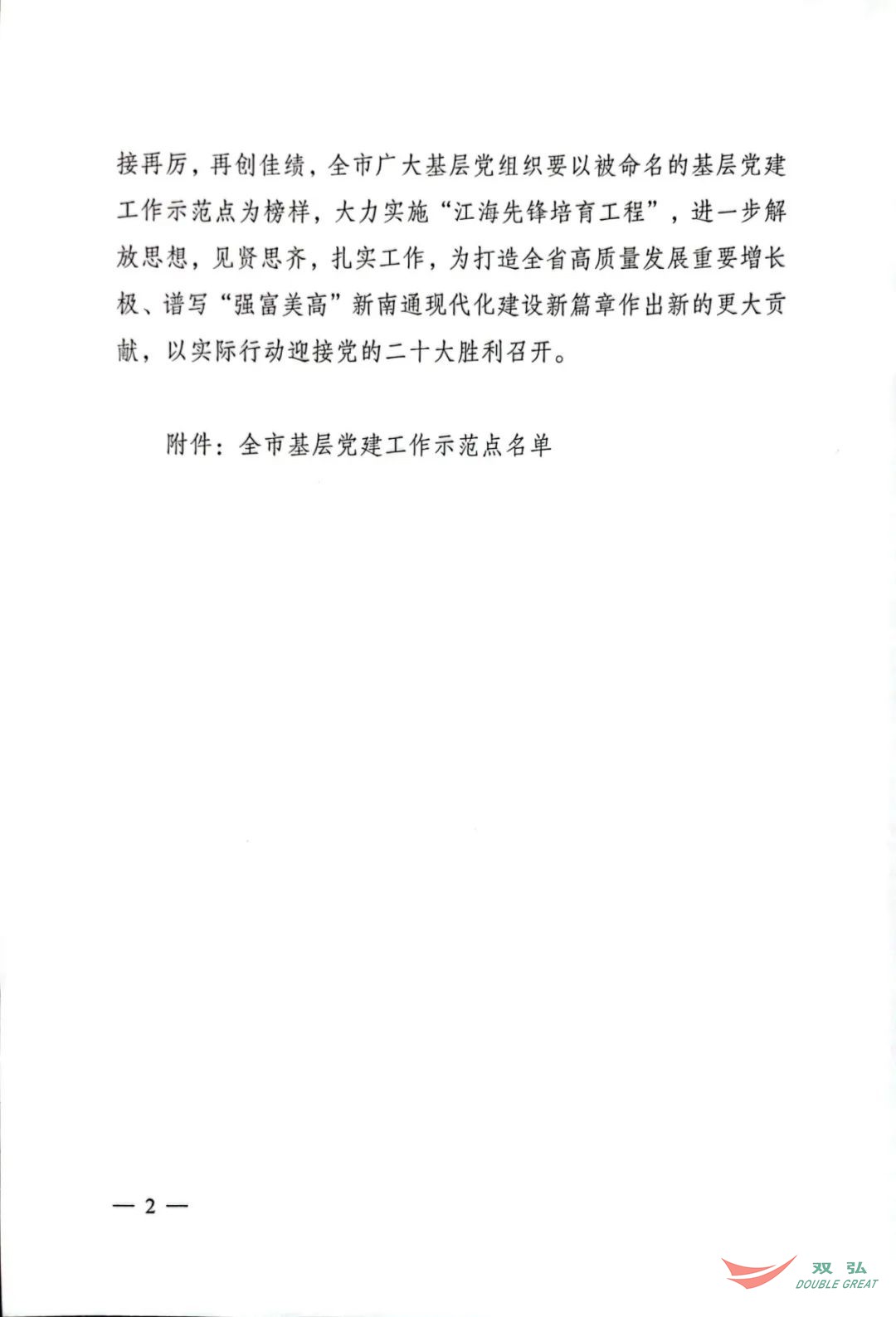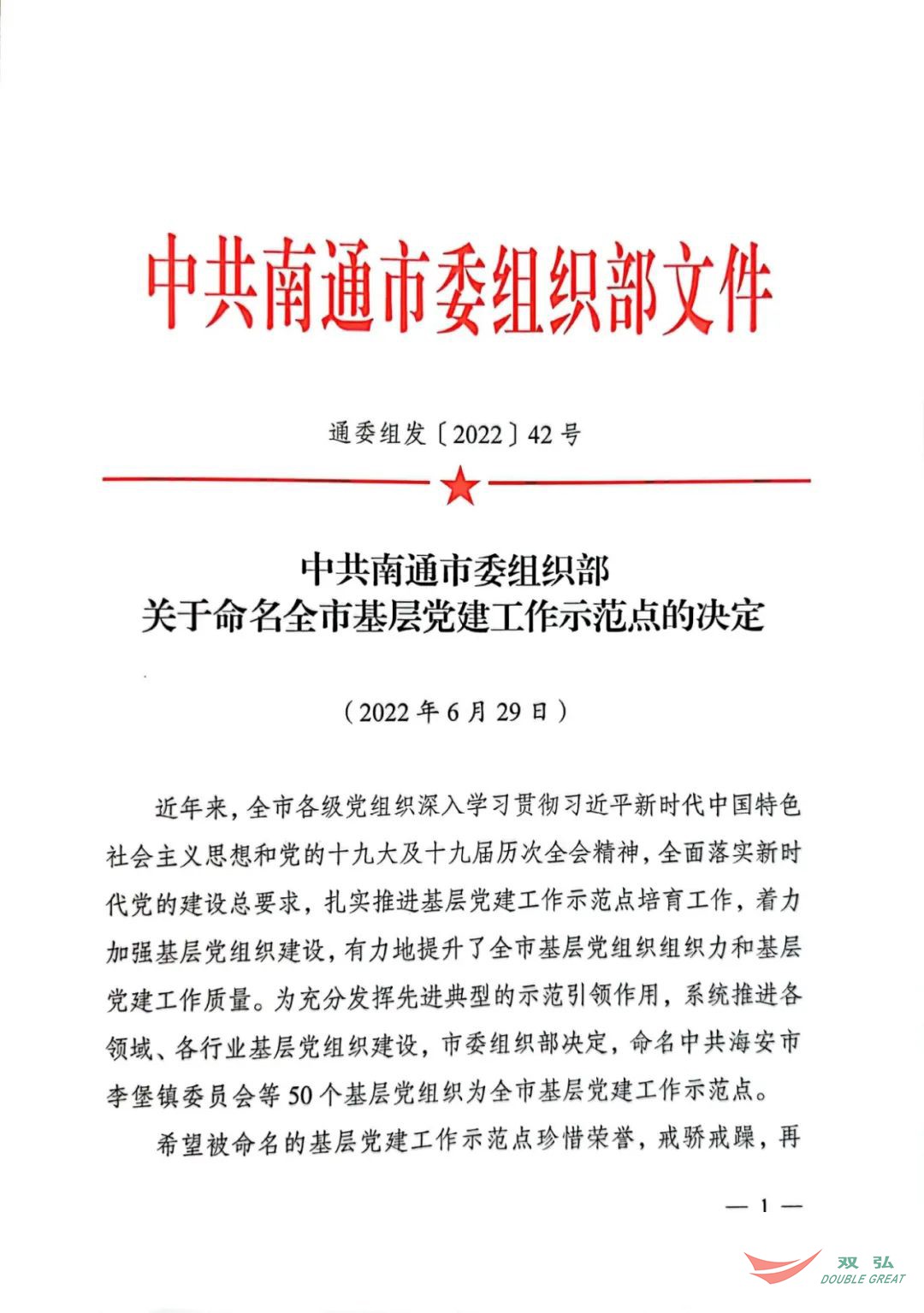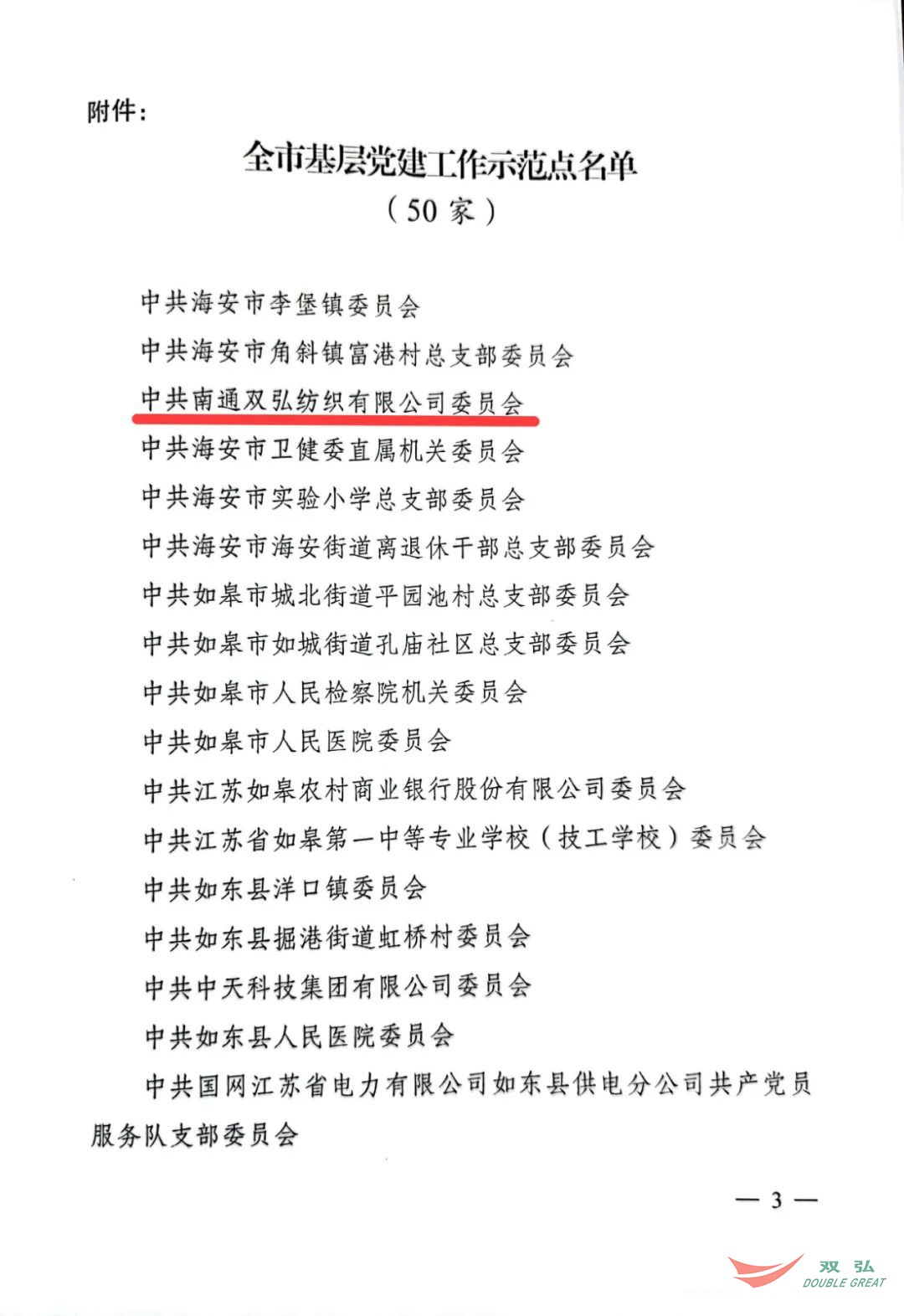 Nedavno je Odjel Organizacije općinskog odbora CPC Nantong izdao dokument koji je imenovao 50 organizacija stranačkih stranaka kao gradski demonstracijski gradski demonstracija stranke. Odbor stranke Nantong Double Great Textile Co.,, Ltd., dobio je titulu "Gradske strane demonstracijskog mjesta za izgradnju partije".