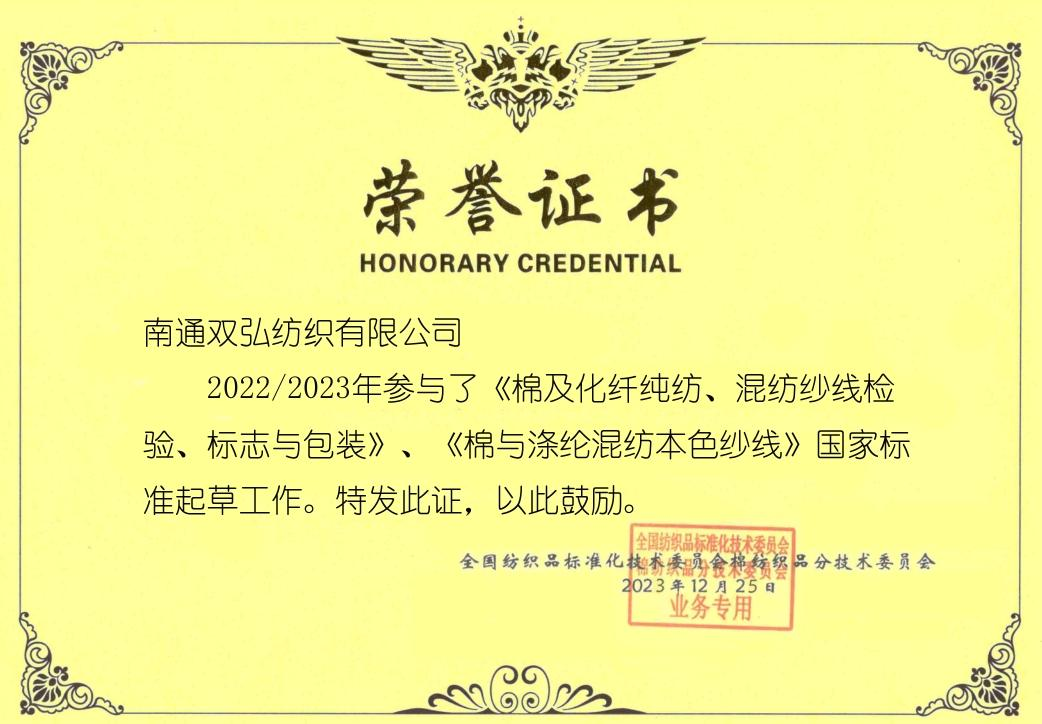 Kao zamjenica generalnog tajnika Nacionalnog tehničkog odbora za standardizaciju pamučnog tekstila i Članica Tehničkog odbora za standardizaciju kineskog nacionalnog vijeća za tekstil i odjeću, Dvostruka sjajna tvrtka aktivno sudjeluje u aktivnostima standardizacije, sudjeluje u formulaciji i reviziji razni standardi, preuzima inicijativu poduzeti sastavljanje i pregled standarda i iznijeti mnoga vrijedna mišljenja. Neki inovativni prijedlozi su usvojeni i učvršćeni, postajući glavna verzija standardnog nacrta. Dvostruka sjajna tvrtka has successively formulirana 3 nacionalna standarda, 11 industrijskih standarda, 4 grupna standarda i 3 Carinska obrada Trgovačka jedinica standardi potrošnje i osvojili su naslov nacionalne napredne jedinice za standarde tekstilne industrije i Nacionalno poduzeće s izvanrednim doprinosima standardizaciji tekstila.